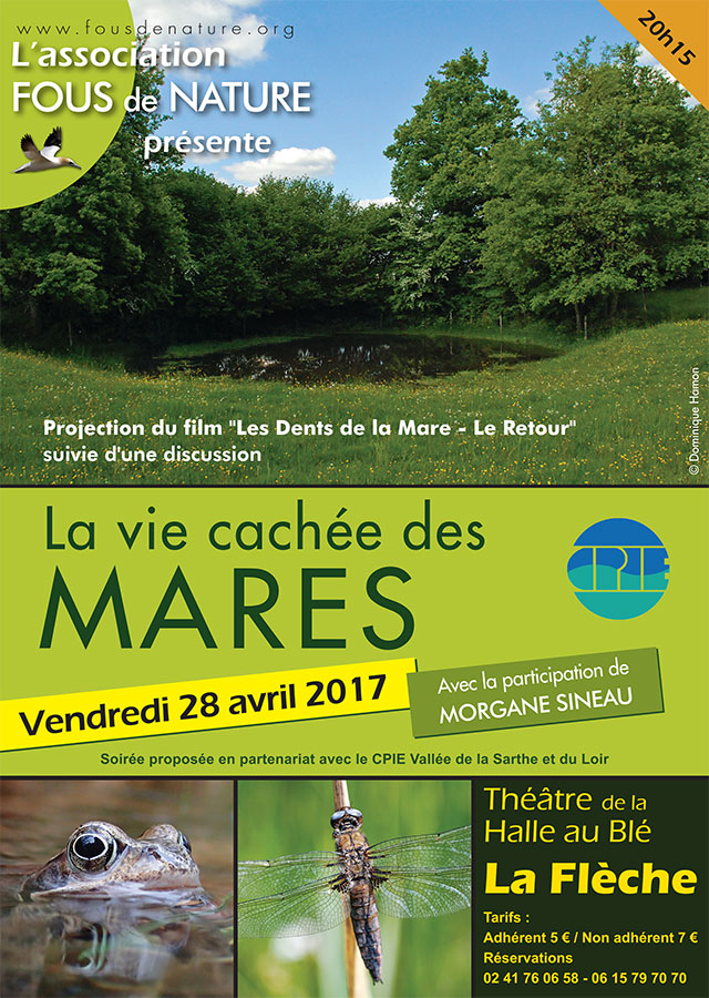 Après la projection du film "Les dents de la mare - Le retour" de Daniel Auclair, film primé au Festival mondial de l'image sous-marine en 2011, Morgane Sineau, chargée de missions Eau et Biodiversité au CPIE Vallée de la Sarthe et du Loir, nous présentera la vie cachée des mares. Une merveilleuse découverte des espèces animales et végétales, ainsi que le rôle que jouent ces petits plans d'eau dans notre région et ailleurs. Morgane Sineau donnera également des conseils pour celles et ceux qui entretiennent ou veulent avoir une mare dans leur jardin.