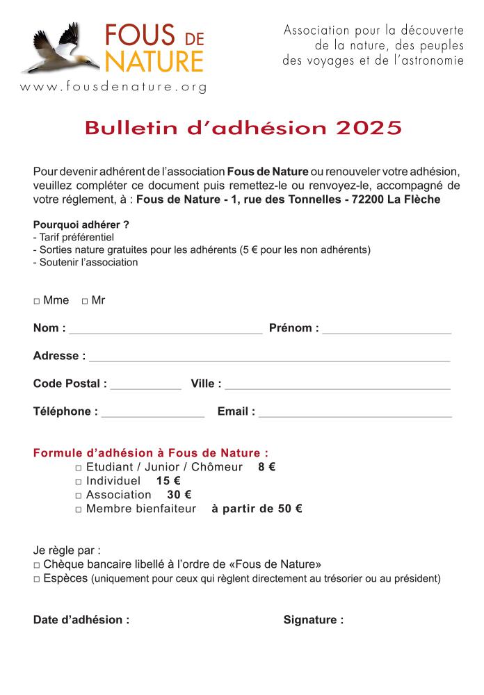 Vous pouvez adhérer à Fous de Nature pour profiter de tarifs préférentiels sur les entrées des évènements organisés par notre association mais aussi être prioritaire lors du lancement des réservations. Votre adhésion permettra de soutenir nos projets (soirées, expositions, découverte du ciel...).