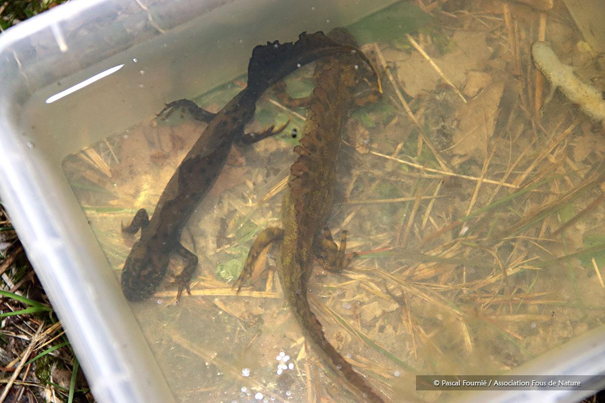 La promenade se poursuivait vers une deuxième mare semblant vierge d'amphibiens, puis vers un étang où des pontes de grenouilles agiles et de crapauds étaient particulièrement bien visibles. Enfin, c'est au niveau de la dernière mare que les participants allaient enfin pouvoir observer sous tous les angles des tritons palmés (5 femelles et 1 mâle), des tritons crêtés (2 mâles et 1 femelle) et un mâle de triton Blasius.